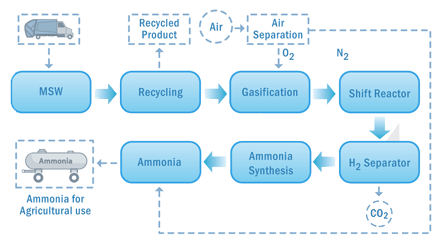 For the production of ammonia, the solid MSW fluff is reacted with